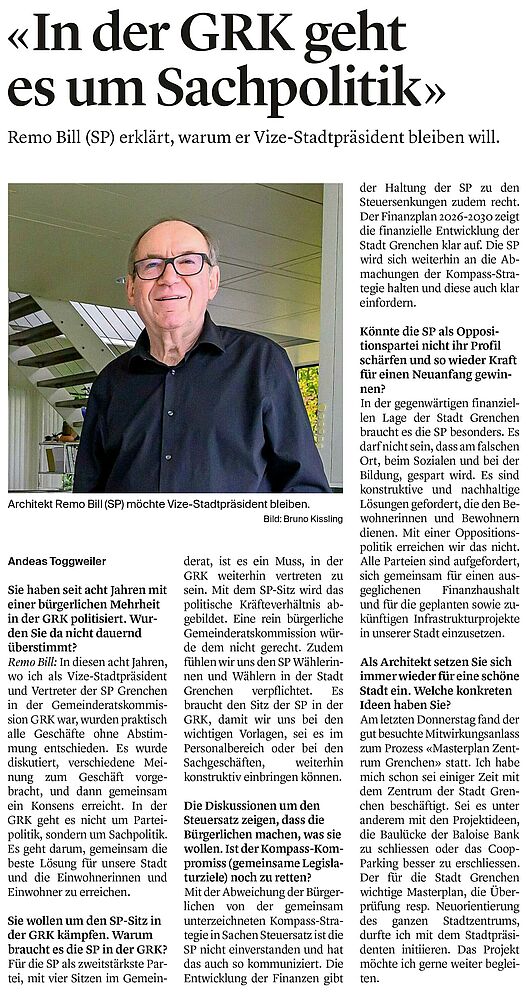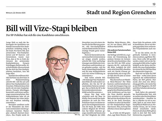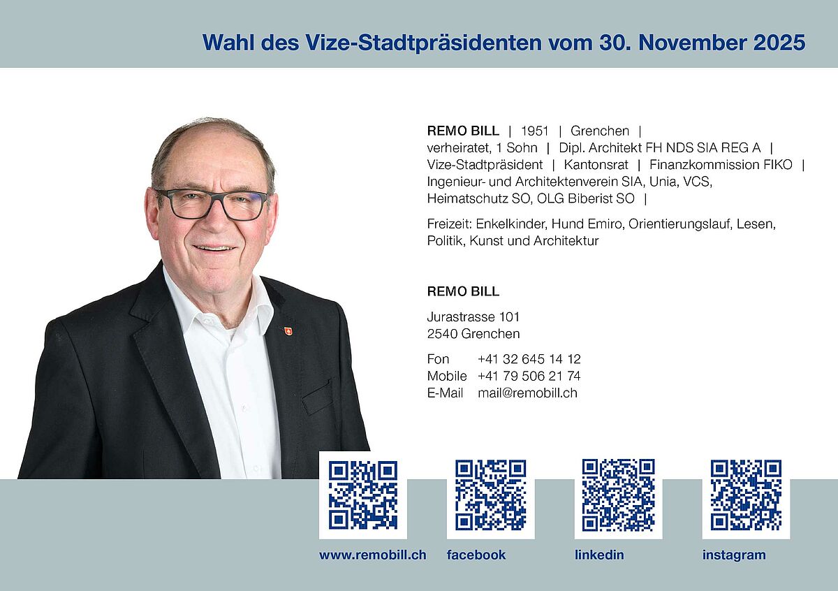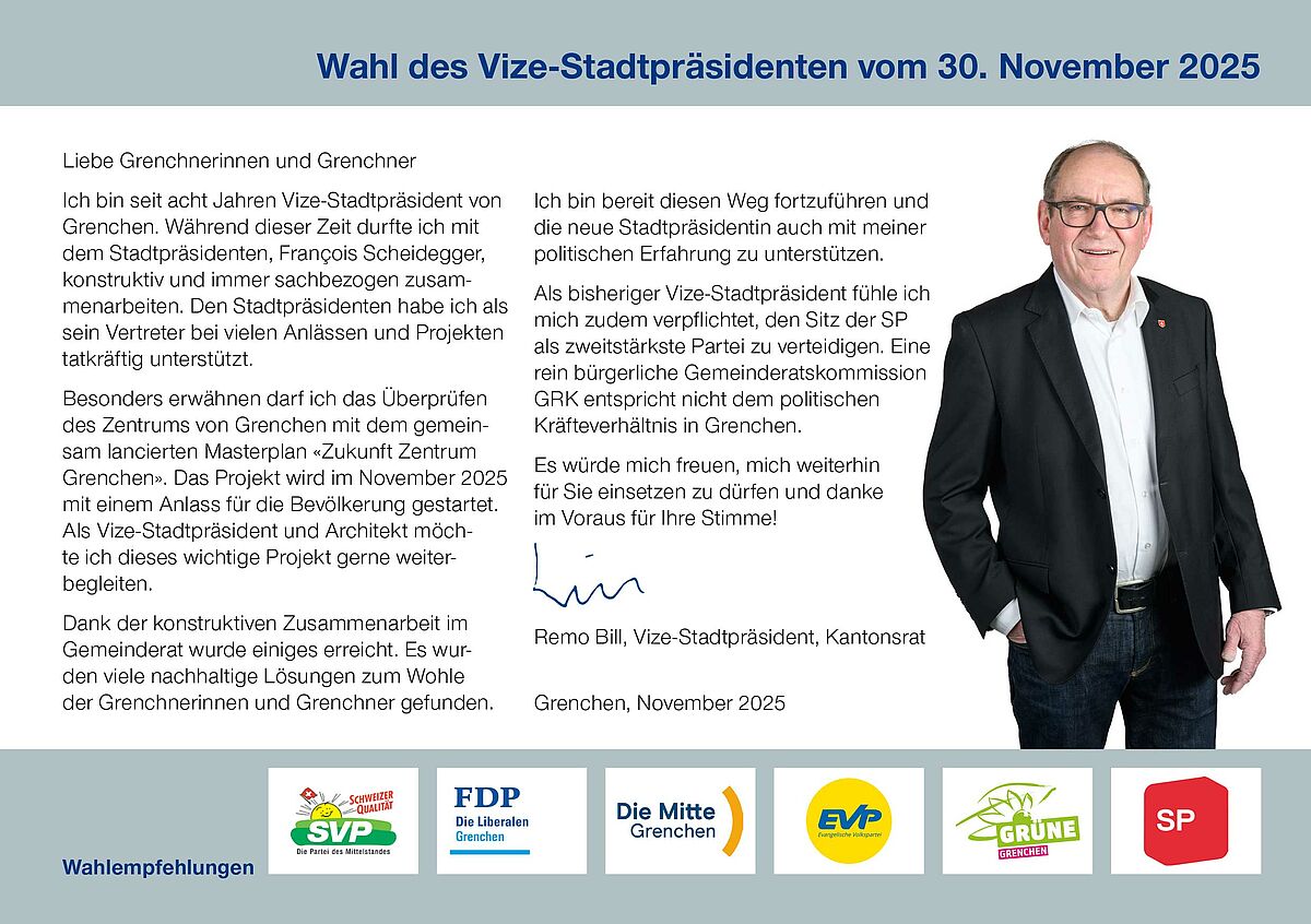 Als bisheriger Vize-Stadtpräsident fühle ich mich zudem verpflichtet, den Sitz der SP als zweitstärkste Partei zu verteidigen. Eine rein bürgerliche Gemeinderatskommission GRK entspricht nicht dem politischen Kräfteverhältnis in Grenchen.